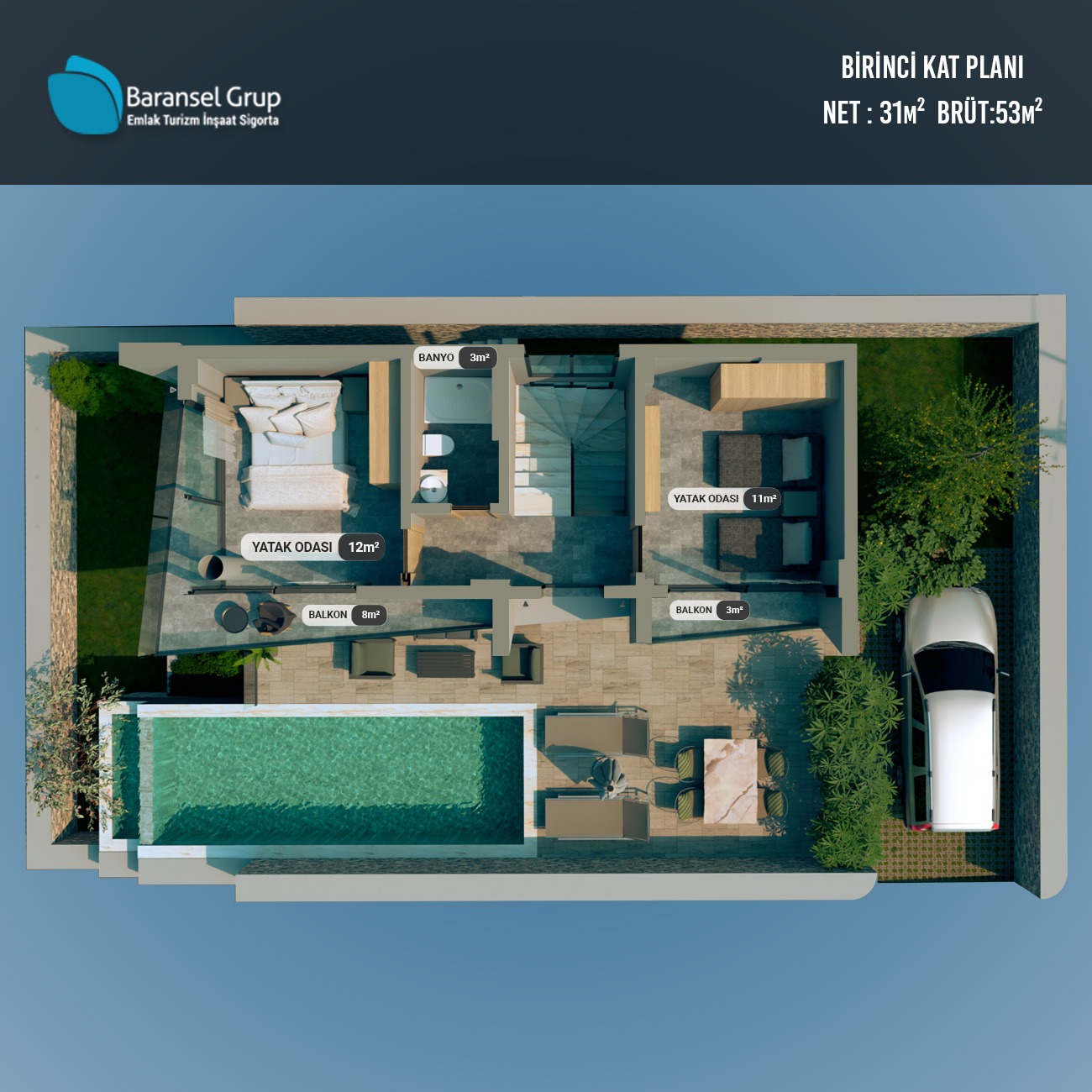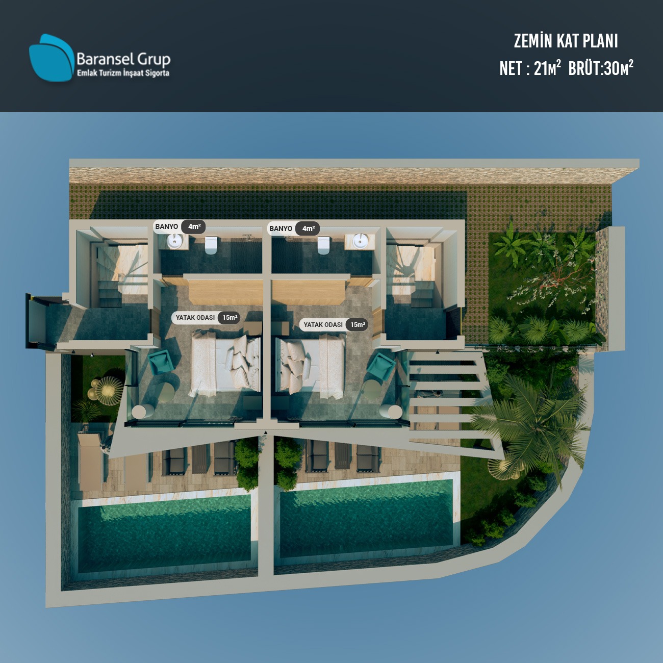 Her villa, özel bahçe alanı, geniş terasları ve havuzuyla size ve sevdiklerinize tamamen kişisel bir yaşam alanı sunar. Teraslardan havuza uzanan ferah mimari, doğa ile bütünleşen taş dokular ve modern özelliklerle donatılmış iç mekânlar, konut sahiplerine yılın her günü tatil konforunda bir yaşam sağlar.
